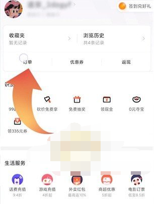 2、在我的页面,点击收藏夹下方的订单;