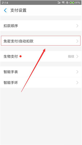 4、在支付设置里,找到“免密支付/自动扣款”点击进入。