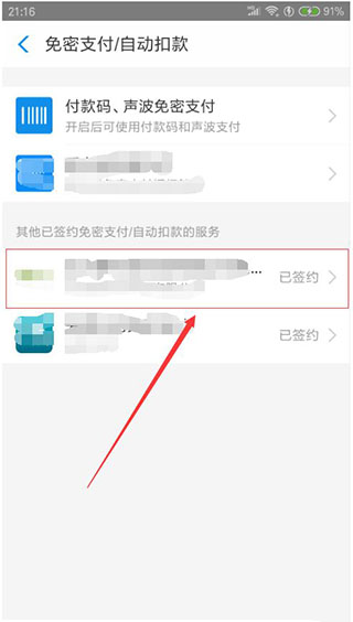 5、然后在免密支付/自动扣款界面里,我们找到要解除自动续费项,点击进入。