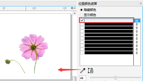 2、界面右侧弹出的位图颜色遮罩泊坞窗中选隐藏颜色即将选定的颜色隐藏。在颜色列表中选择最上面的一个颜色条勾选。