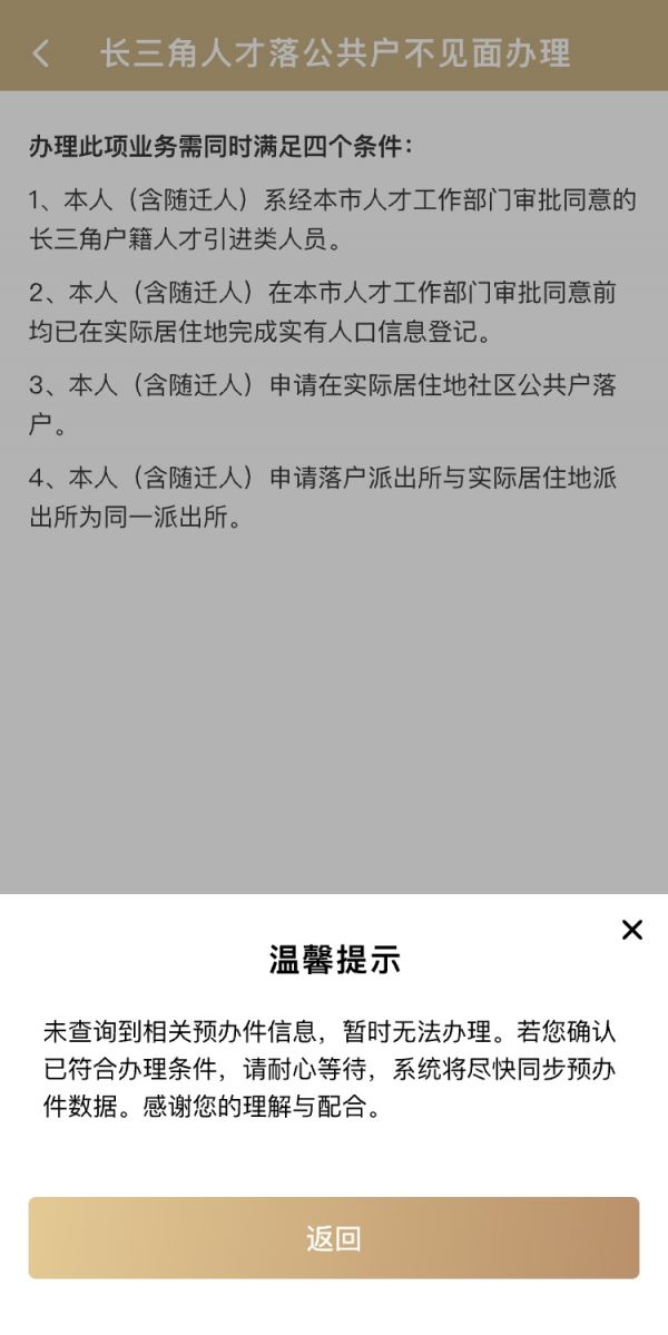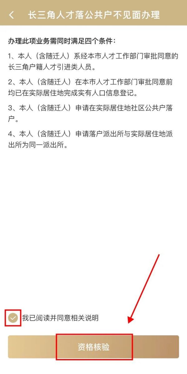 在专栏中,选择“长三角人才落户共户不见面办理”,确认是否同时满足四个条件,确认无误后勾选并点击“资格核验”。