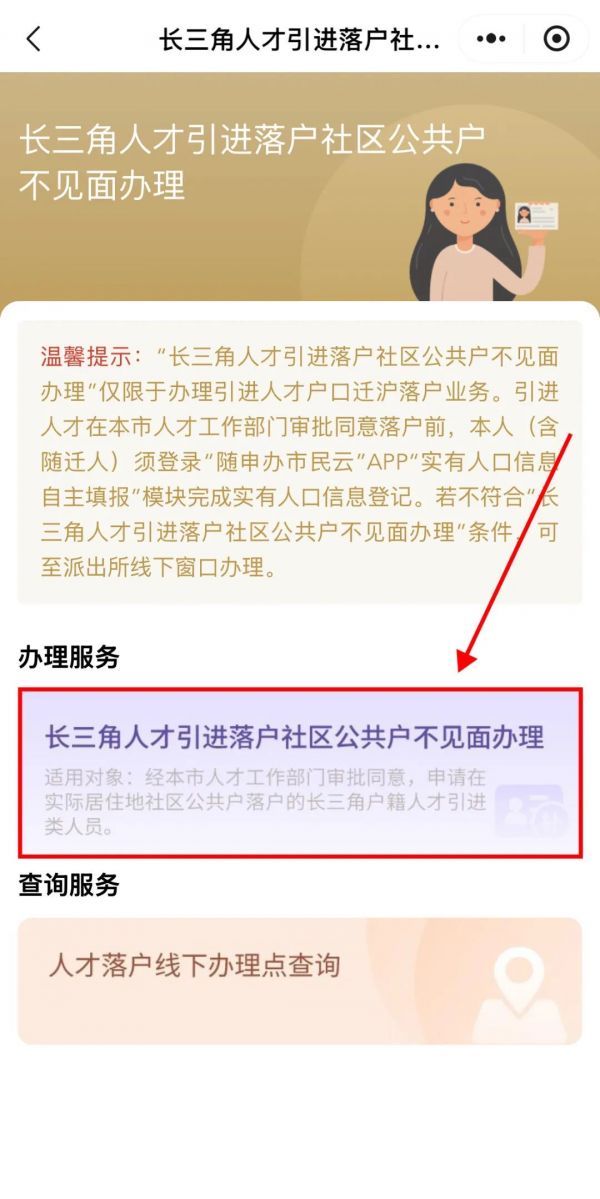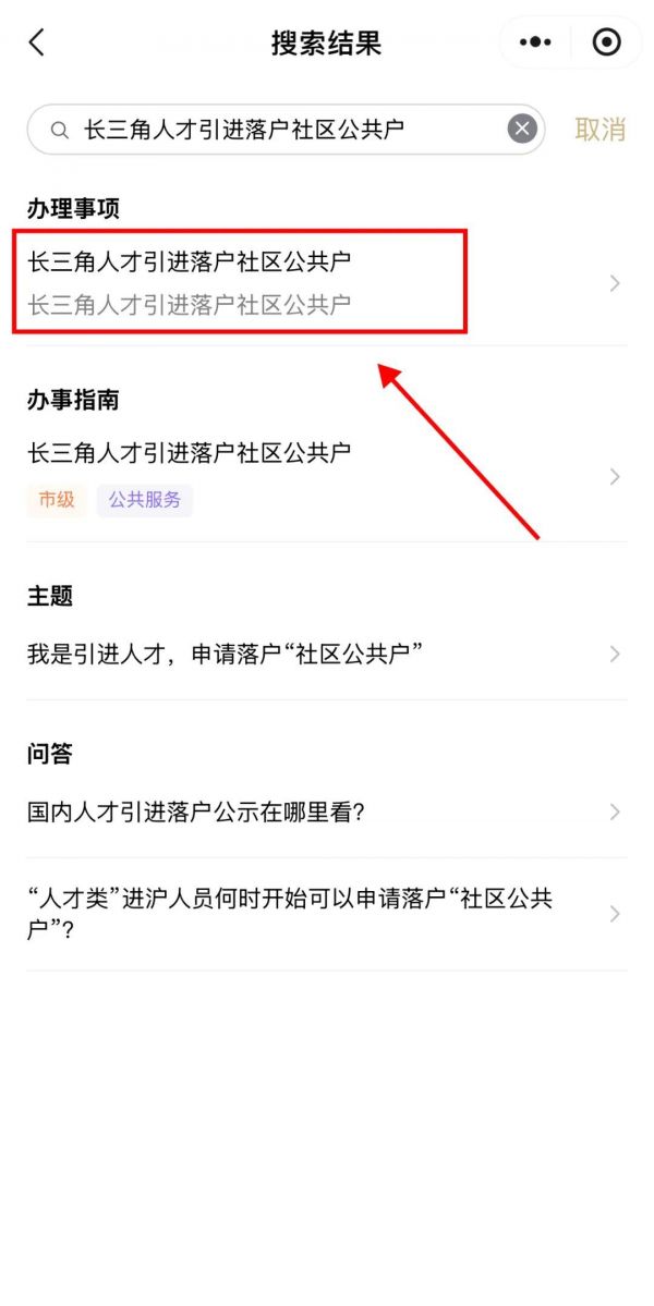 打开“随申办市民云”(app/微信小程序/支付宝小程序),首页搜索“长三角人才引进落户社区公共户”点击进入专栏。