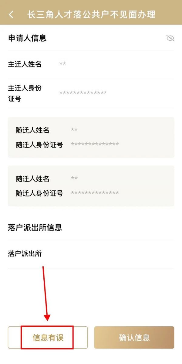 若申请人在信息页面发现信息存在错误,请点击“信息有误”选项。随后按照系统指示退出当前办理界面,并前往落户地派出所线下窗口办理相关业务。