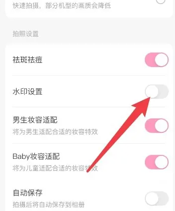 如下,进入更多设置中,将【水印设置】后的按钮关闭即可