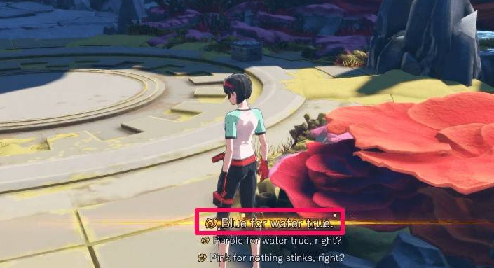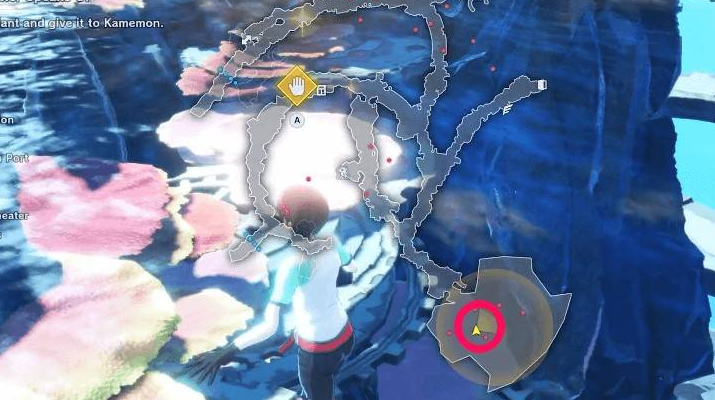 接着去水中寻找紫色水生植物,其位置在黄色圆圈中心偏西的闪光点处。