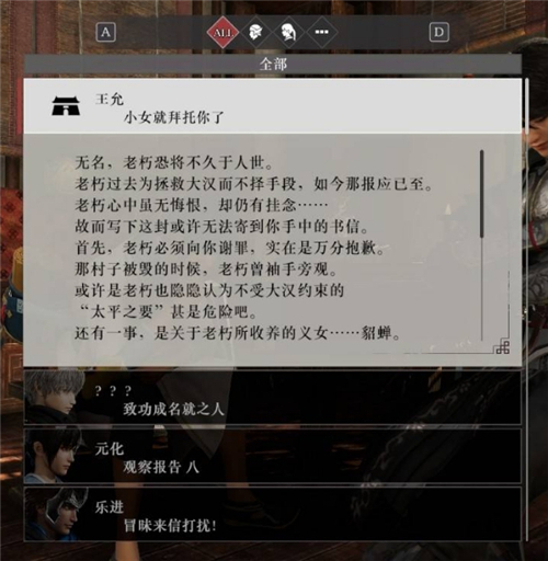 貂蝉最后一级情谊需要司隶太平值达到3级(可能需要领取完所有司隶的太平值奖励,可能需要主线剧情推进至后期,尚未明确),进入旅店阅读王允的书信,之后即可触发貂蝉最后的剧情。
