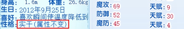 (2)魔攻69,它的天赋为9、防御52,它的天赋为30、魔防45,它的天赋为4。