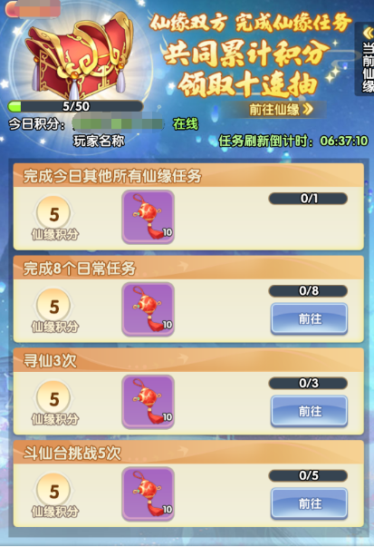 欲结仙缘者,修为达标的道友可创仙缘小队,每个小队仅限两名道友,创队者即为队长。小队成员共赴每日仙缘任务,可积攒仙缘积分。每累积50积分,双方均可获得一次十连抽的宝箱奖励。