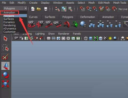 1、打开maya,在该界面内将模块切换为animate模式,