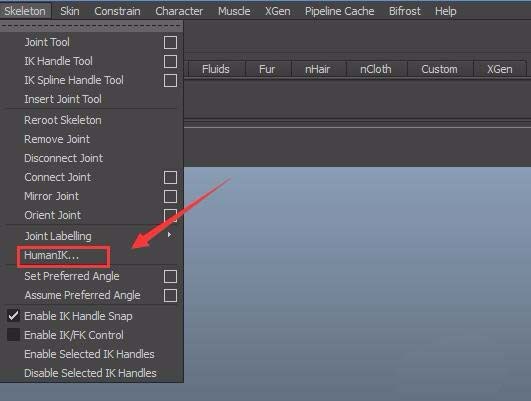3、点击skeleton选项在其子级菜单里就会找到humanIK选项,